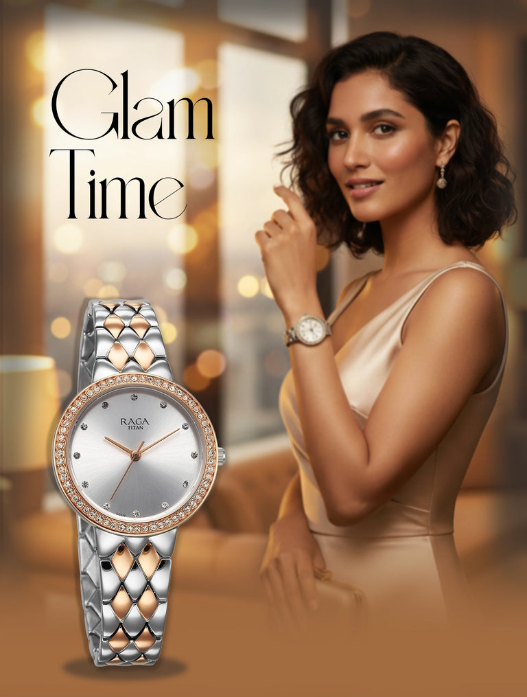 Titan Raga Showstopper Quartz Analog Silver Round Dial Two Toned Metal Strap Watch For Women 95282KM01